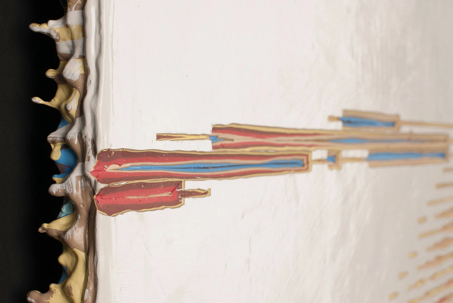 Acrylic paint is pigment suspended in a polymer emulsion–plastic–petroleum–fossil fuel–dinosaurs. Coats of paint, poured over wood panels, function as strata of sediment and time separating us from Earth’s extinct overlords. The prehistoric subjects are excavated from the applied layers of paint by carving out articulate trenches, revealing the true nature of paint.